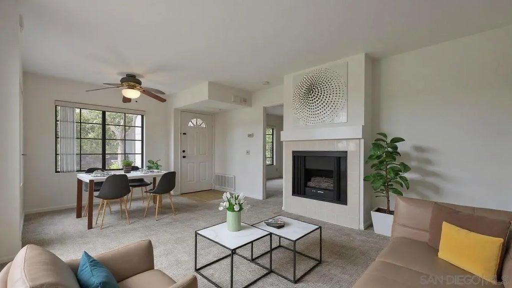 PRICED TO SELL! Located in the sought-after Sun Ridge Vista community of Rancho Peñasquitos, this beautifully refreshed one-bedroom, one-bath residence effortlessly blends comfort, convenience, and contemporary charm. Perched on the second floor, the home welcomes you with abundant natural light streaming through oversized windows and a cozy fireplace that anchors the bright, airy living room. The open-concept layout flows seamlessly into a dining area and an inviting covered patio—perfect for relaxing or entertaining—with the added benefit of extra storage and an in-unit washer and dryer. The efficient kitchen features gas cooking, generous cabinetry, and ample counter space, while the spacious bedroom offers a large closet and an updated ensuite bath. Recently enhanced with fresh paint, new carpeting, and central air and heating, this turnkey home also includes a designated covered parking space. Residents of Sun Ridge enjoy access to resort-style amenities including three sparkling pools, a spa, and a well-equipped fitness center. Just steps away lies Sun Ridge Vista Park, offering a playground, basketball courts, and walking trails. With its prime location near shopping, dining, and easy freeway access, this home is a must see! VA AND FHA APPROVED COMPLEX!