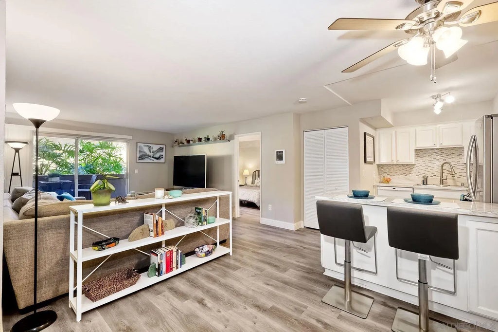 Gorgeous 2 Bed, 2 Bath Condo w/ a prime location near SDSU! This beautifully upgraded home is perfectly situated on the first floor for effortless, stair-free living & has 1 assigned parking space. The open floor plan was designed for privacy w/ bedrooms & baths on opposite sides making this an excellent setup for roommates, guests or a peaceful home office/retreat. Enjoy designer wall colors, luxury vinyl & tile flooring and a sleek kitchen featuring white cabinetry, quartz counters, SS appliances and a breakfast bar peninsula. The spacious living room opens to a relaxing patio surrounded by lush landscaping. The primary suite includes tall windows, dual closets and linen cabinets. The second bedroom also has tall windows and a walk-in closet. Both bathrooms are tastefully upgraded with modern finishes. Community amenities include a pool, rec room, BBQ area, plus water and trash service. Just steps from SDSU, hospital, restaurants, shops, trolley & Lake Murray - Be at the heart of San Diego living!