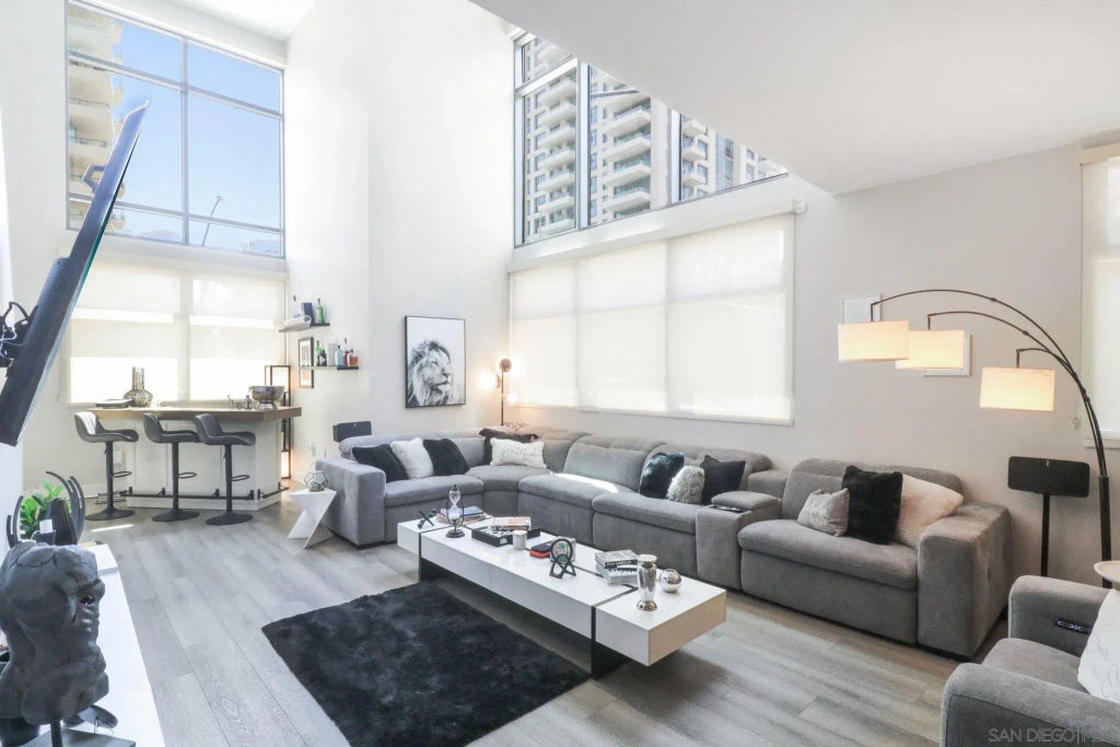 Rare 3-Bedroom Townhome in the Heart of the Marina District. Experience the feel of a downtown home with the convenience of luxury condo living at Renaissance in the Marina District. This spacious 3 bed, 3 bath residence spans nearly 2,000 sq ft and offers a rare street-level entry, perfect for guests or live/work flexibility. Inside, enjoy dramatic ceilings, floor-to-ceiling windows, and an open-concept kitchen featuring a Sub-Zero refrigerator, stainless steel appliances, and a large island ideal for entertaining. The thoughtful layout includes one bedroom and full bath on the main level, plus two ensuite bedrooms upstairs, including a generously sized primary suite and in-unit laundry. Recent updates include custom anti-sound curtains for added privacy and comfort. Located just steps to grocery stores, fine dining, Petco Park, and the waterfront.