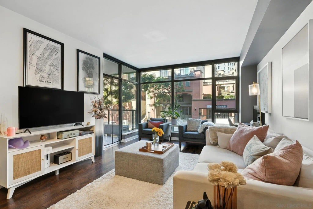 Welcome to Aria, one of downtown San Diego’s most stylish and modern residential towers. This sleek residence blends comfort, design, and convenience in the heart of the city. Floor-to-ceiling windows flood the home with natural light and showcase vibrant city views, while the open-concept layout creates a seamless flow for both relaxing and entertaining. Rich wood flooring adds warmth throughout the living space, and the contemporary kitchen is appointed with quartz countertops, stainless steel appliances, and ample cabinetry, offering both functionality and style. The living room extends to a private balcony, an ideal spot for enjoying your morning coffee or winding down in the evening. The spacious bedroom provides excellent storage, while the spa-inspired bathroom features clean lines and a polished design that enhances the home’s modern feel. Residents of Aria enjoy access to premium amenities, including a resort-style pool and spa with a sundeck, a state-of-the-art fitness center, a fully equipped business center, and elegant community lounge spaces. Perfectly located in the desirable Cortez Hill neighborhood, Aria offers a quiet residential atmosphere while keeping you just moments from Little Italy, Balboa Park, and the lively Gaslamp Quarter. With convenient freeway access and close proximity to shopping, dining, and San Diego’s scenic waterfront, this residence offers an exceptional combination of style, comfort, and location.