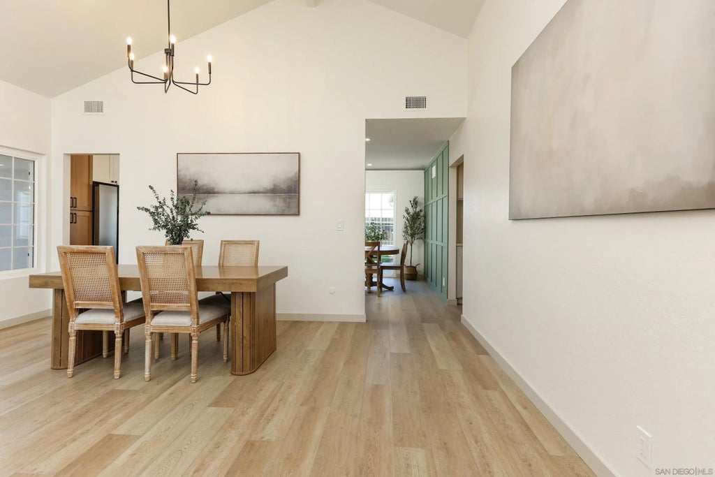 Beautiful Single-Story, Northwest Mira Mesa home with High Ceilings & Large Flat Backyard. Situated on a spacious 5,100 sq. ft. lot with a Large Flat green yard. The highlight is the Expansive Primary Suite, providing comfort and privacy. The living room impresses with its Soaring Pitched Ceilings, wood-like flooring, and elegant fireplace. The kitchen is the heart of the home, showcasing an Oversized Waterfall-Edged Island, stainless steel appliances, European-style pendant lighting, and striking two-tone cabinetry, all tied together with a custom breakfast-nook accent wall. Both bathrooms have been tastefully appointed with sleek, high-end finishes. Additionally, the home offers the convenience of Central HVAC. Don’t miss this RARE Mira Mesa gem!