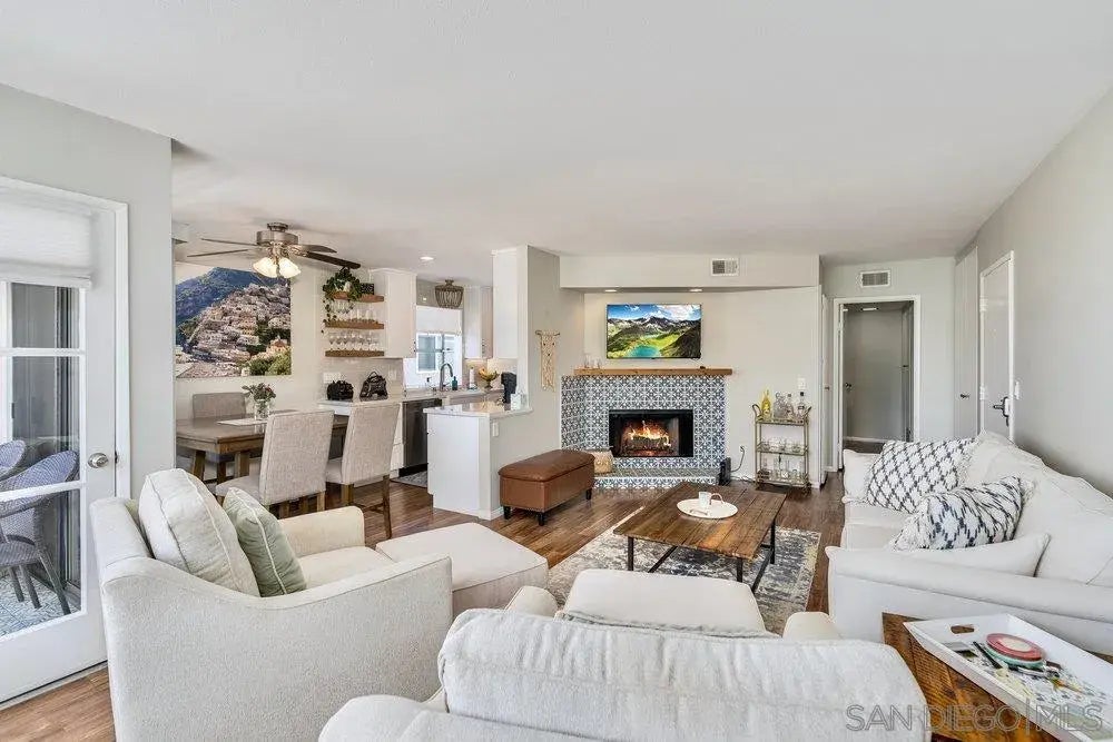 Discover your perfect coastal retreat—a top-floor sanctuary in a beautifully maintained community, ideally located just minutes from Sunset Cliffs, Ocean Beach, Downtown, and Mission Bay. Natural light pours through large windows, highlighting the open living space designed for comfort and style. Imagine cozy evenings by the fireplace, morning coffee on your private balcony with ocean-kissed air, and effortless weekends exploring Liberty Station or strolling the sand. The kitchen is appointed with a gas range, microwave, dishwasher, and newer refrigerator—ready for everything from casual meals to festive gatherings. A full-size washer and dryer are conveniently located inside the home, making everyday living simple. Both bedrooms are generously sized. The primary suite provides a restful retreat, while the second bedroom offers flexibility for guests, a home office, or fitness space. With a BRAND-NEW ROOF already installed, this home is move-in ready. The community offers lush landscaping, two sparkling pools, a relaxing spa, and covered parking. HOA dues cover water and trash, adding ease to ownership. Whether you’re looking for a full-time residence, a coastal escape, or an investment property, this home is an exceptional opportunity to own a piece of San Diego’s coveted lifestyle—effortless, inviting, and ideally located.