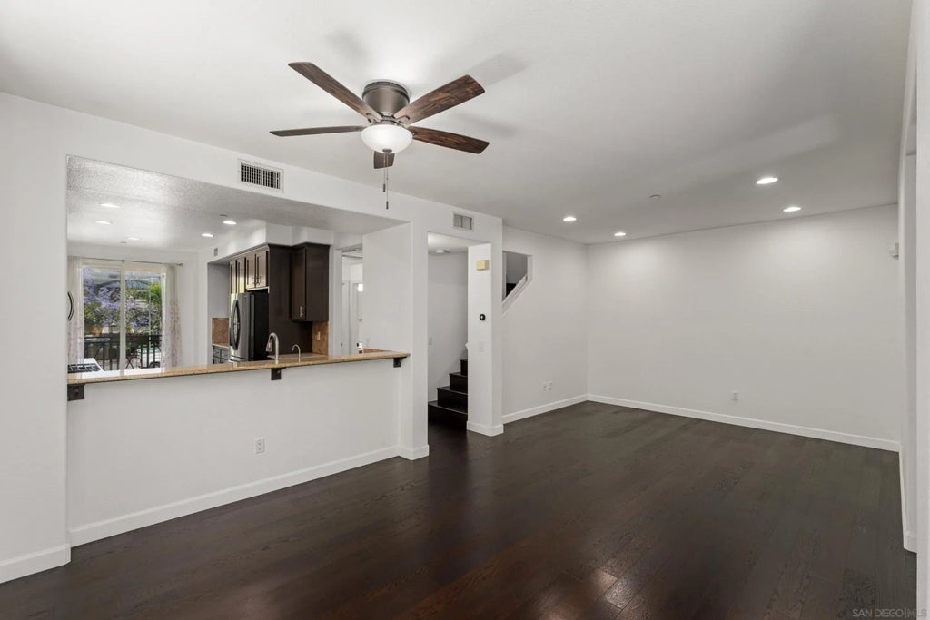 FHA/VA Approved! Bright, welcoming, and ideally located, this end-unit townhome in the Tribeca community offers a smart layout and everyday comfort in the heart of Kearny Mesa. Set on a quiet street lined with palm trees and just steps from a local park, the home blends modern convenience with easy access to shopping, dining, major freeways, and everyday essentials. Inside, you’ll find a thoughtfully well-maintained space featuring hardwood flooring, dual-pane windows w/ custom window treatments, and recessed lighting throughout. The open-concept kitchen is both functional and inviting, with stainless steel appliances, granite countertops, a stylish tile backsplash & ample cabinet and counter space. A breakfast bar adds flexibility for casual meals or entertaining. The main level features two private balconies with no direct neighbors, offering added privacy and a peaceful setting for morning coffee or evening relaxation. The layout flows smoothly into the living and dining areas, with a guest bedroom and full bathroom just down the hall. Custom designed closets with added storage in each bedroom enhance both style and organization. An in-unit washer and dryer complete the convenience of the second floor. Upstairs, the primary suite occupies the entire floor, offering a private retreat with an ensuite bathroom. Amenities include a two-car tandem garage with built-in cabinets & workspace and forced a/c, while the community provides pool, spa, and BBQ areas. Take advantage of this rare opportunity to own in one of San Diego’s most convenient and well-connected neighborhoods.