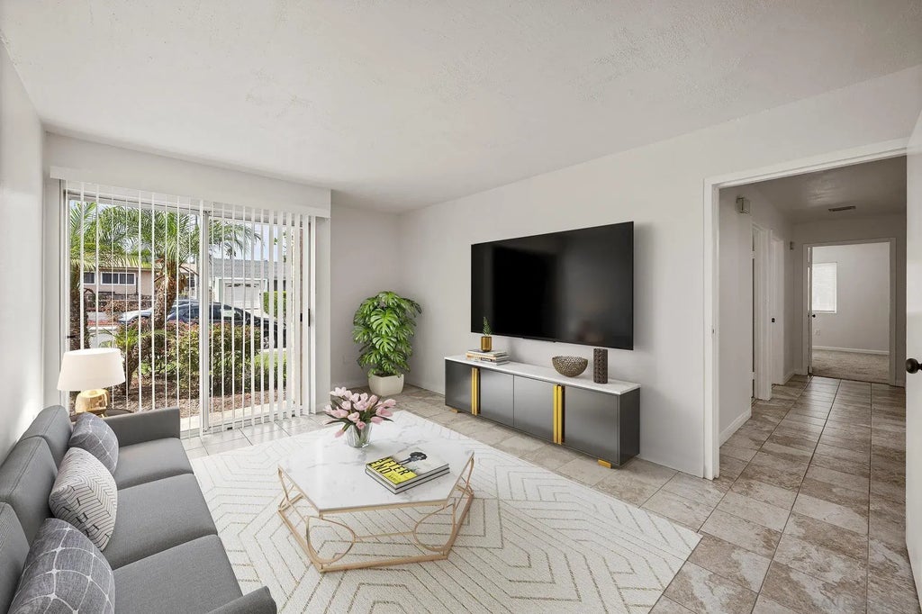 Located in the heart of Poway, with top-rated schools nearby, this beautifully updated turnkey condo boasts 3 bedrooms, 2 baths, and 937 sq. ft. of living space. Situated on the ground level, the open floor plan offers a personal storage unit and 2 parking spaces, 63 and 21. Recent upgrades include fresh paint, new carpet in the bedrooms, a new range, a new wall A/C unit, a new master bedroom tub and full bath shower, new window covers, and tile flooring throughout. The condo is centrally located, within walking distance to grocery stores, restaurants, movies, and hiking trails. Move-in ready. VA approved.