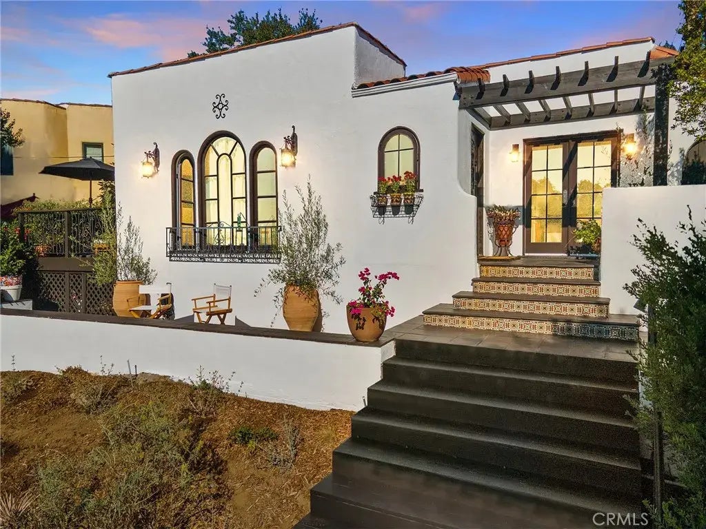 Welcome to this classic California Spanish Revival home in Adams Hills. Drama begins with the wide staircase that leads to this masterfully cared-for beauty. As you ascend, breathtaking views open up- the Verdugo Hills, twinkling city lights, and distant mountains. Inside, graceful archways frame the entries and hallways, while abundant French doors and Spanish-style windows bathe the interiors in natural light. Pure walnut floors add timeless richness underfoot, while original Wallace Neff lighting fixtures cast a warm, historic glow. Step outside to 600 square feet of wraparound decks with multiple spaces for entertaining or quiet retreat. The expansive primary suite offers generous built-in closets and drawers, plus a luxurious en suite walk-in closet. The kitchen is a chef's dream, featuring a Lacanche stove with both gas and electric ovens, alongside a Bosch refrigerator and dishwasher. Recent updates - electrical, HVAC, and insulation - ensure modern comfort, while a freshly painted exterior makes the home sparkle. With total privacy, no cars in sight, and sunshine streaming throughout, this is truly a slice of heaven.