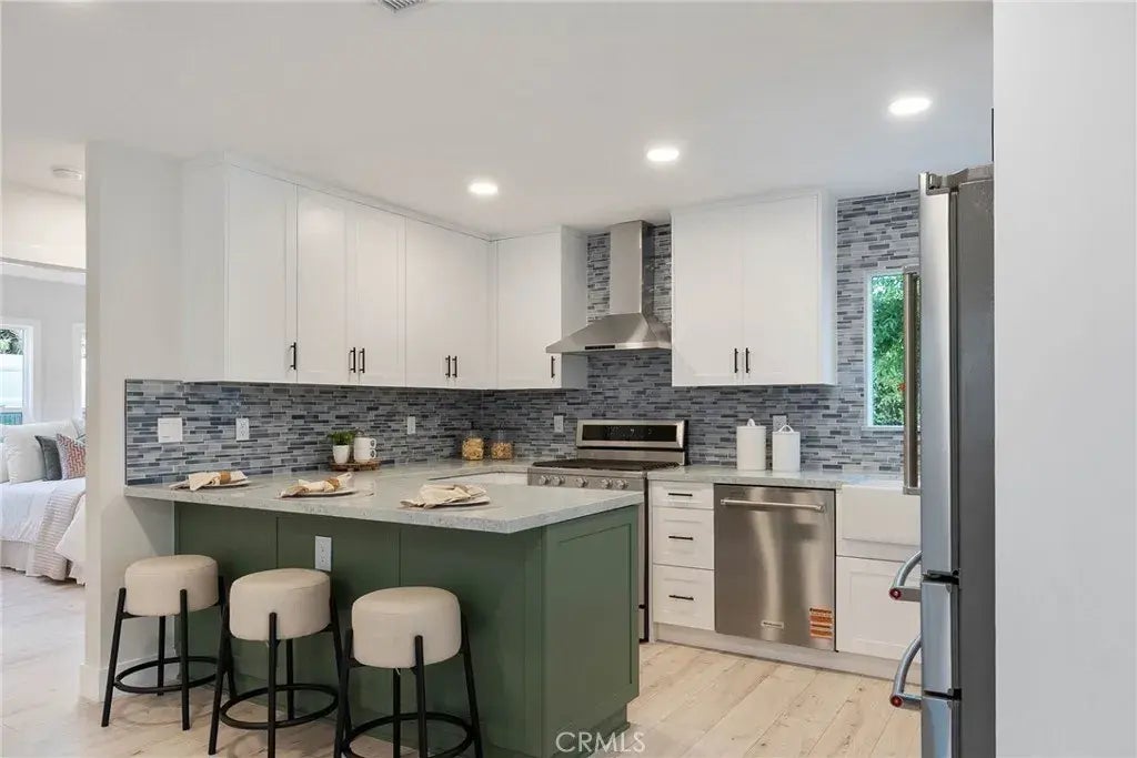 Completely remodeled home in the Los Altos neighborhood of Long Beach! Three bedroom, two bathroom, new kitchen, appliances, flooring, bathrooms, windows, lighting. You name it, it's new. One car garage with EV charging, and additional parking in the driveway. Garage is attached and laundry is in home for your convenience. Central heat and air for added convenience. Beautiful front porch to relax on and also a back porch. Close to transportation, Cal State Long Beach, shops, stores, and food. This is the front home and there are two small ADU's on the property.