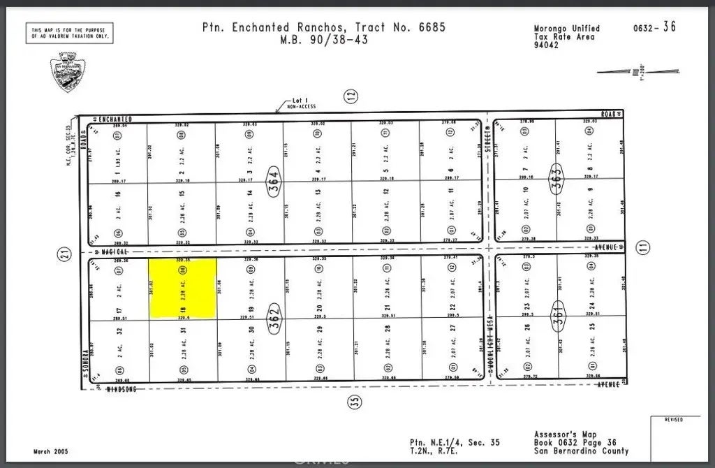 Level parcel in outlying area of north Sunfair Heights. Not far from the popular Joshua Tree National Park. Good access to the property and not too far from paved road. Inside Joshua Basin Water District. GPS Coordinates: 34.220790,-116.214102 2.28 ac lot next door to the south is also for sale for $24,900(APN: 0632-362-09). Seller may discount the price if both lots are sold as a package. 34.220869,-116.214432