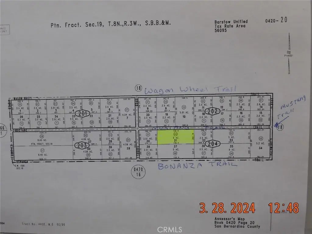 Beautiful 5 acre parcel with well, located in rural neighborhood of Helendale. Owner had the well tested by a private party, using a generator, and they were able to get water. Another big plus, this property was recently surveyed (within the past 4 years). Parcel is on the south side of Mustang Trail, 0.55 miles east of Frontier Rd. It is the 2nd parcel east of Sorrel Rd (4th parcel east of Sorrel Trail). This property is just before a parcel that has a lot of stuff on it. See satellite photos in listing.