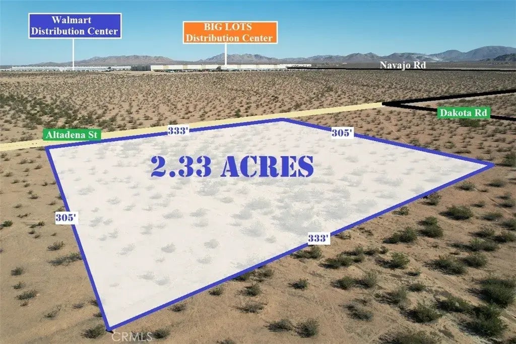 For sale level lot 2.33 acres zoned Specific Plan which allows for Commercial/Industrial use. Water hydrant and sewer line close by. Sewer line located Altadena St & Dakota Road (buyer to verify). Close to WalMart Distribution Center and Big Lots Distribution Center. APN#0463-371-52.