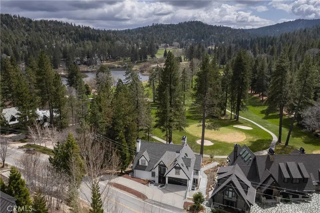 Exquisite luxury meets panoramic serenity at this fully renovated masterpiece, situated prominently on the 6th green of the prestigious Lake Arrowhead Country Club. Set within an exclusive celebrity-owned neighborhood, this residence offers unmatched views of multiple golf holes and picturesque Grass Valley Lake, with captivating vistas from every room. Meticulously redesigned, this home underwent a comprehensive renovation featuring rare and exotic finishes from RH, Arhaus, and Schoenbeck. Step into a formal foyer accented by wide plank hardwood flooring extending across the main level. The open floor plan integrates a sophisticated dining space with a gourmet kitchen, showcasing an oversized marble-topped island, Arabescato marble slab backsplash, Sub-Zero refrigerator, Wolf stove, four Wolf ovens, Cove dishwasher, drawer microwave, and elegant RH hardware. Breathtaking floor-to-ceiling windows illuminate the main living room, crowned by a striking authentic deer antler chandelier, custom cabinetry, and integrated smart home system operated via strategically placed iPads. The adjacent octagonal room offers remarkable golf views, perfect as an office or creative sanctuary. The main-level primary suite is a private retreat with vaulted ceilings, a luxurious stone fireplace, deck access, custom walk-in closet, and an opulent spa-like bathroom featuring heated floors, expansive Kohler-equipped shower, opulent $7,000 bidet toilet, and a custom Opal White Granite illuminated bathtub wall. The expansive weatherproof tile deckover 1,000 sq ftextends seamlessly from the office to
