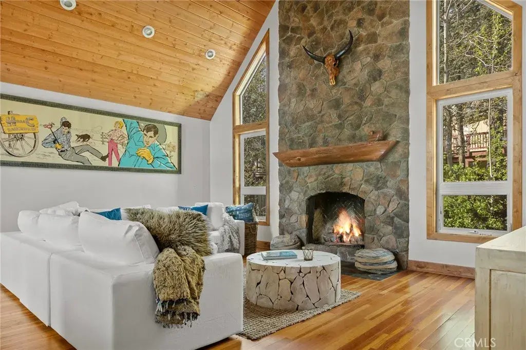 346 Bel Air is a rare opportunity to own a single-level home with full Lake Rights in one of Lake Arrowheads most desirable neighborhoods. Thoughtfully appointed, this home showcases a refined, modern mountain style and an updated interior feel enhancing each space. Set on a beautifully treed lot with a landscaped approach, this home offers level entry and living just minutes from the Lake Arrowhead Country Club and Golf Course. A spacious & open layout feature vaulted rough-sawn ceilings, a dramatic floor-to-ceiling stone fireplace, hardwood radiant heat floors, and expansive floor-to-ceiling windows that flood the home with natural light and capture peaceful treetop views. The primary suite is privately situated and features a generous walk-in shower, dual vanity, and walk-in closet. Two additional bedrooms and a guest bath offer comfort and flexibility for guests or family. A separate full laundry and wash room, tankless water heater, low-maintenance siding, and full-house generator switch provide peace of mind and everyday convenience. Outdoor living is just as impressive with an elevated composite deck that spans the length of the homeperfect for relaxing, entertaining, or enjoying a quiet mountain morning. A direct-entry two-car garage adds ease and functionality, while a full second-story footprint is already in place, making future expansion simple and strategic. Tastefully updated furnishings are available for purchase, making this a truly turnkey opportunity in a coveted mountain setting.