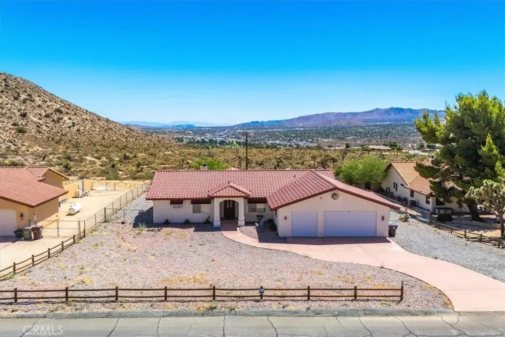 Beautiful home, beautiful views high in the hills in the very desirable country club neighborhood is this modern style gem of a home on over a half acre lot. Featuring 3 bedrooms, 2 baths and a bonus room for an office, den, studio or other. The great layout boasts a split bedroom design with a large primary bedroom with a beautiful ensuite bathroom. The primary bathroom has dual vanity sinks and a large walk in closet that has a window in it to allow for natural light. The living area is also spacious and has a great view from the near wall length windows and sliding glass door. Pull up to the exhibition kitchen counter which makes for a great entertainers spot for those who love to cook. Plenty of cabinetry in the kitchen and a lot of counter space. There are really nice tile floors in the entry, kitchen, dining area and bathrooms and the bedrooms are carpeted. The laundry area is also well equipped with plenty of counter space and storage and the 3 car garage provides ample space for your vehicles, tools or toys. It is obvious that the previous owner's pride of ownership provides for a well maintained and cared for home. You will find that the homes location is a great attribute. Being high up in the hills with no neighbors behind the home to obstruct the stretching views across the valley you can see for miles. The fully fenced back yard is a relaxing retreat with nice patios a gentle slope and private views. From this location it is not a far drive to the shops, restaurants and venues of Yucca Valley, chic Pioneertown and downtown Joshua Tree as well as only just over