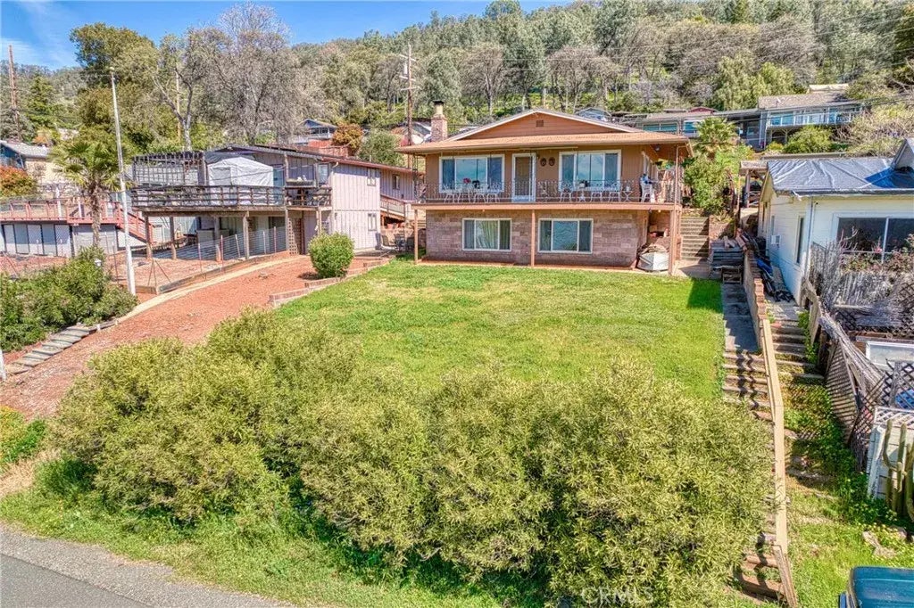 STUNNING LAKE VIEWS from pretty much every room except the bathroom! This 3 bedroom 2 bathroom home with exceptional lake views, 2 car garage with work-shop/storage under it, plus boat dock across the street is available and ready for a new owner. Lot across street with dock, boat house and electric boat lift pays lakebed management encroachment fee of around $130 yearly (per seller). 2 bedrooms and 1 full bathroom upstairs of around 1,024 sq ft of living space plus a covered wrap around deck. Sit on the deck and enjoy your favorite beverage and watch the sunset. Upstairs features original real 3/4 inch hardwood flooring throughout. Living room has a door leading to the deck, wall fireplace and magnificent views of the lake. Upstairs bathroom was fully remodeled a few years ago. Kitchen has stainless steel appliances (dual sink, refrigerator, oven, electric cook-top), also view of lake. Home has a new mini-split system and double pane windows upstairs and down. Laundry room has a deep stainless sink, washer and dryer hook-ups plus custom cabinets for storage. There is a nice cement ramp leading from the garage down to the house, terraced yard with lemon and orange trees, fenced yard. Downstairs bedroom/bonus room has lots of storage and a 3/4 bathroom with walk-in shower, estimated another 500-600 sq ft (per seller). Also copper plumbing throughout per seller. This is a beautiful home with lots to offer. Buyer/ buyers agent to verify sq ft of home.