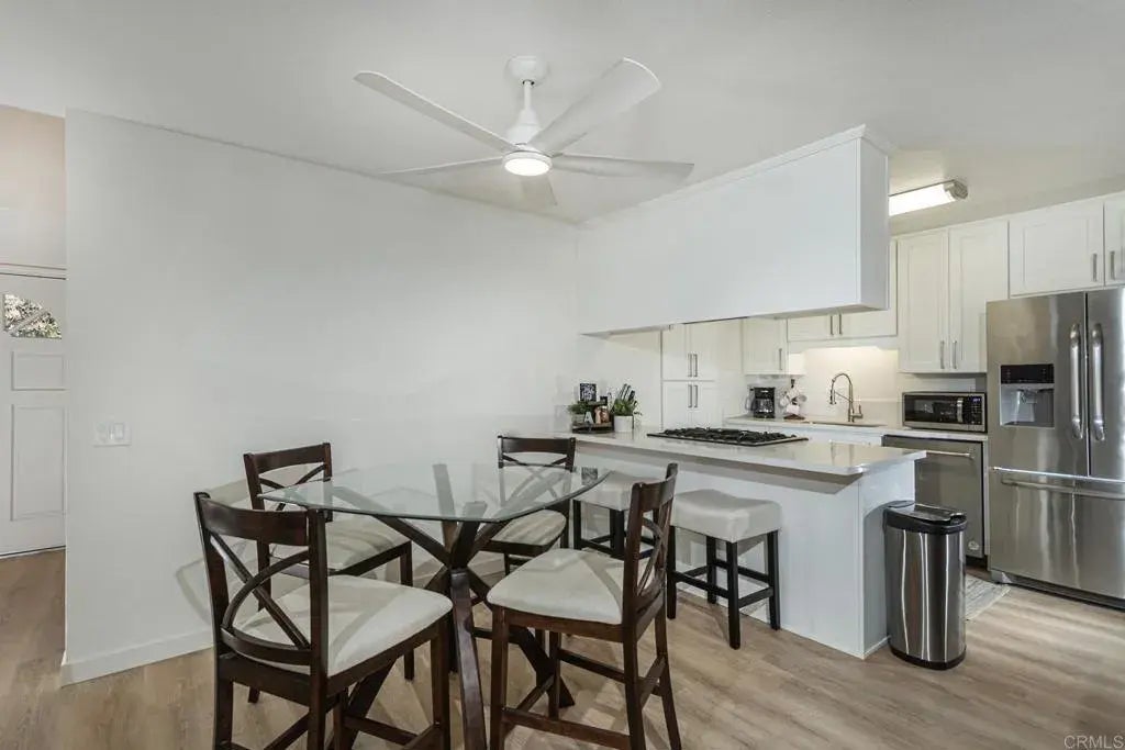 MOTIVATED SELLERS! PRICED BELOW APPRAISED VALUE. Stylishly updated condo ideally located just 1.1 miles from the renowned Moonlight Beach and within easy reach of upscale shops and vibrant dining, this beautiful home offers the perfect coastal lifestyle. Rarely available, this 9-unit building includes a charming green space accessible from the patio. Step inside to a striking high-entry foyer with a skylight, setting the tone for this inviting home. The renovated kitchen features quartz countertops with bar seating, under-cabinet lighting, new flooring, and stainless-steel appliances, plus a convenient spice cabinet. The living room's centerpiece is a stunning gas fireplace, complete with a stone hearth, wrought iron door, reclaimed wood ledge, and a brick surround with outlet. Upstairs, plush new carpeting enhances the comfort of two ensuite bedrooms. Skylights in the bathrooms bathe the space in natural light, while full-wall closets in both bedrooms provide ample storage. The primary suite includes a private balcony to watch the sunset, an indoor window to enhance the ocean breezes and dual sinks for added convenience. A half bath is located on the main level, along with direct access to the attached one-car garage. An additional assigned parking space is conveniently located just outside the building entrance. Dont miss this rare opportunity to own a coastal retreat in a prime location!