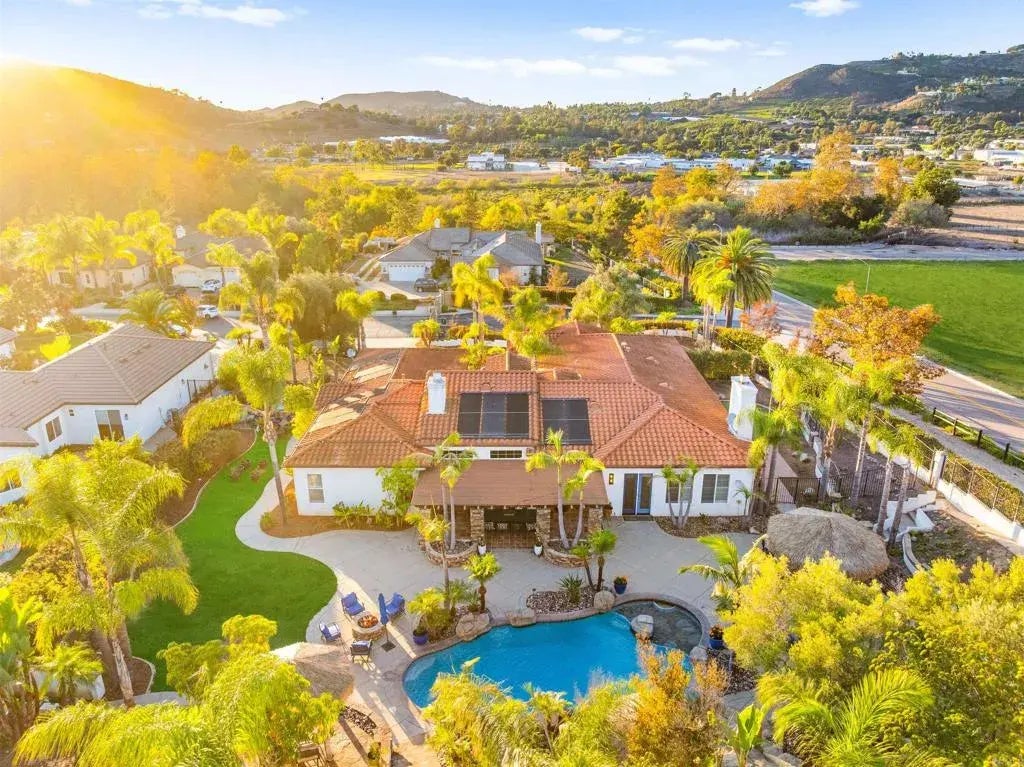 Welcome to the highly sought-after gated community of Rosemont Estates, an exclusive gated enclave of just 18 single-story homes nestled in the heart of Twin Oaks Valley, San Marcos. Each property rests on an acre or more of land, and homes here rarely come to market. In fact, this is the very first time this stunning residence has ever been offered for sale. Designed as the ultimate entertainers retreat, this home is truly the perfect gathering place. A Saltillo-tiled walkway leads through a charming courtyard with firepit, arched entry, and tiled fountain, reminiscent of the classic La Costa Spa. Custom tilework accents walls, stairs, and architectural details throughout, setting the tone for the homes character and style. Inside, striking 10-foot ceilings, laminate wood floors, and tumbled tile highlight over 3,600 square feet of living space. The formal living room with a grand fireplace and adjacent dining room create an elegant setting for entertaining, while the private owners wing features a luxurious primary suite with trey ceiling, space for oversized furnishings, and a spa-like bathroom complete with walk-in shower, soaking tub, and dual walk-in closets. The secondary wing offers three generously sized bedrooms, each with remodeled ensuite baths, along with a home office or optional 5th bedroom just off the entry. At the heart of the home, the open-concept design seamlessly connects the gourmet kitchen, featuring a large granite island, Sub-Zero refrigerator, abundant cabinetry, walk-in pantry and bar alcove with wine fridge. Adjacent to the spacious family room,