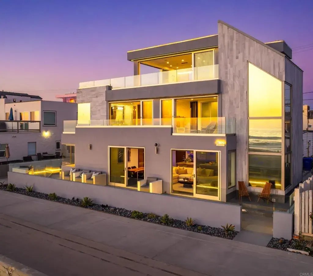 Perfectly positioned on the coveted front row of Mission Beach, this fully reimagined architectural residence captures panoramic ocean views from every level, offering a lifestyle defined by beachfront elegance, thoughtful design, and seamless indooroutdoor living. Spanning three levels of striking industrial-modern detail, the home is wrapped in floor-to-ceiling sliding glass doors that bring the Pacific into every moment of the day. The main level welcomes you with an open-concept layout anchored by a bespoke chefs kitchen, featuring a 5-burner range with direct ocean views and a sleek waterfall island. The living and dining areas flow effortlessly to a private ocean-facing patio, where an eight-person hot tub and multiple lounge spaces create a dynamic setting for hosting and relaxation just steps from the boardwalk. The second floor is home to the primary suite, a private retreat with its own ocean-view balcony, freestanding soaking tub positioned for sunset views, curbless walk-in shower, and dual vanitiesall finished in refined, spa-like detail. This level also includes two additional bedrooms, two full bathrooms, and a convenient laundry room, offering both function and flexibility for guests or family. The top floor unfolds into a dramatic entertainers loftan indoor-outdoor pavilion where walls of glass vanish, connecting the interior to a sweeping wraparound terrace. With expansive lounge areas and unobstructed coastal vistas, its a space designed for effortless gatherings, quiet mornings, and evenings defined by the rhythm of the waves. Designer coastal furnishing