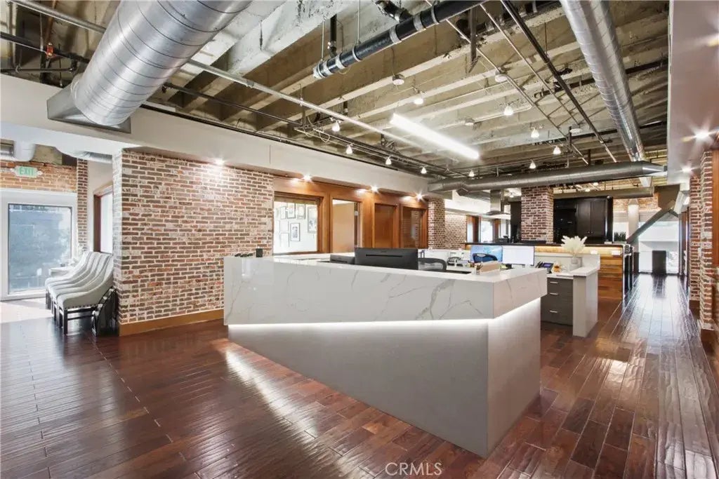 This turnkey creative office space is located on the second floor of a historic building along The Long Beach Promenade, one of the most vibrant pedestrian-only urban dining and entertainment districts in Los Angeles County. Surrounded by popular venues such as The Ordinarie, The Stave Bar, Harvells of Long Beach, Dog Haus Biergarten, and Portuguese Bend Distillery, the space offers a rare opportunity to acquire an entire floor in a prime location. The office features a unique blend of historical charm and modern upgrades, including exposed ceilings, wood floors, exposed brick and beams, operable windows, and abundant natural light throughout. The layout is ideal for both office and residential use, with four large window offices, a spacious reception area, an open kitchen equipped with gas, a dishwasher, and a farmhouse sink, a large conference room, a central area with four built-in workstations, a copy/file/fax nook, built-in wood cabinetry, a storage closet, and an IT room. Additionally, there are separate mens and womens restrooms, each with steam rooms and showers, as well as a laundry facility. The property includes private elevator access, secure building access, and two dedicated parking stalls covered by HOA dues, with additional public and monthly parking options nearby. As a Mills Act Property, it also offers the benefit of property tax savings.