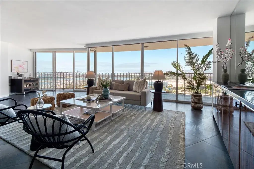 Nestled high atop the Iconic International Tower with views from LA to the Long Beach Coast. This is a spectacular opportunity to live in the heart of the vibrant community of downtown LBC where everything from tranquil views of the sunset to exciting aerial views of the Long Beach Grand Prix are possible from the private wrap around balcony. Upon entering the International Tower, guests & residence are greeted by 24/7 desk service and a beautifully updated lobby with grand piano. Pool room and community room have been updated as well. Unit 2508 has been improved for larger space and more expansive views by removing a wall to make this a 2 bedroom, featuring 2 primary suits on opposite sides of the unit, one with walk-in closet, and an open living room and kitchen in-between. Ideally situated for privacy and function. Views from every room. Electric blinds. Laundry in unit, ceramic tile flooring throughout including balcony. Nicely appointed kitchen with stainless appliances, a wine fridge, recessed lighting and captivating views from the breakfast counter. Finished in fresh neutral paint throughout. This unit is ready to be your showplace.