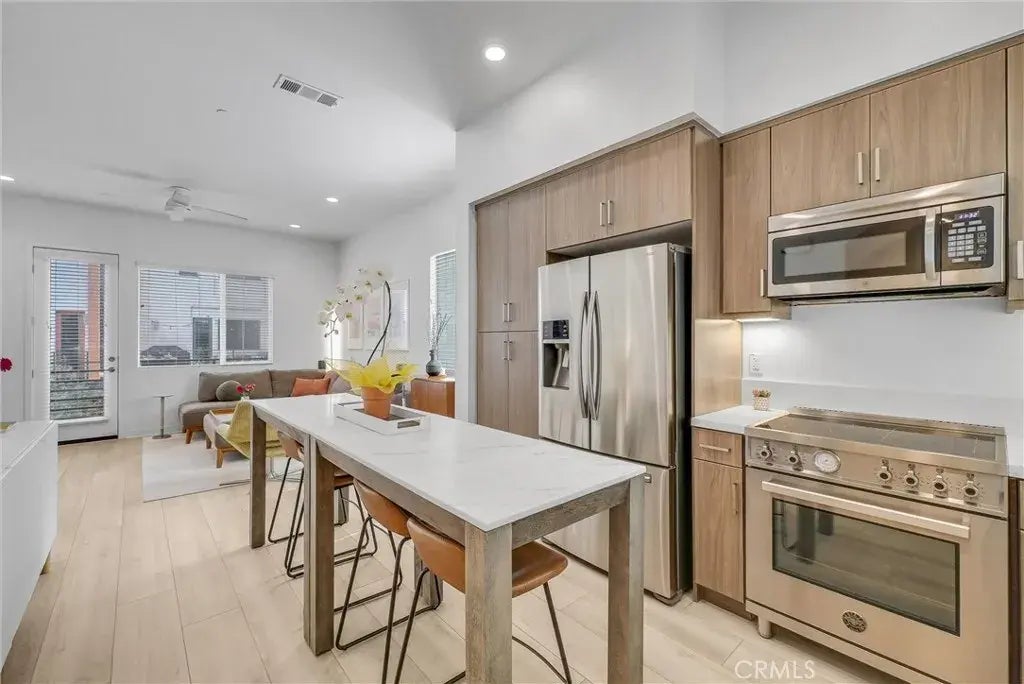 Modern Luxury Living in a Prime Long Beach Location! Welcome to Huxton Development, a newly built (2019) luxury community perfectly positioned between the East Village Arts District and Downtown Long Beach. This stunning corner-unit townhome offers a multi-level layout with two spacious bedrooms, three bathrooms (one on each level), and an open floor plan designed for modern living. Step inside to find high ceilings, recessed lighting, and abundant natural light flowing throughout the home. The modern kitchen boasts quartz countertops, stainless steel appliances, and custom CoreTech flooring, while the in-unit full-sized stackable washer and dryer add convenience. A beautiful fourth-floor balcony overlooks the serene courtyard, offering the perfect spot to relax. Energy-efficient features include solar panels, dual-pane windows, and central AC & heat, making this home as practical as it is stylish. This home also includes an oversized one-car garage with direct access and an EV charging station, a secure gated entrance, and guest parking. Residents can enjoy the beautifully landscaped grounds and clubhouse, perfect for entertaining or social gatherings. Located just steps from trendy coffee shops, restaurants, art galleries, and boutique shopping in the East Village Arts District, this home places you in the heart of Long Beachs vibrant culture. Downtowns nightlife, breweries, and entertainment venues are minutes away, while the beach, waterfront parks, and bike paths offer the perfect outdoor escape. With easy access to public transit, the Metro Blue Line, and major freewa