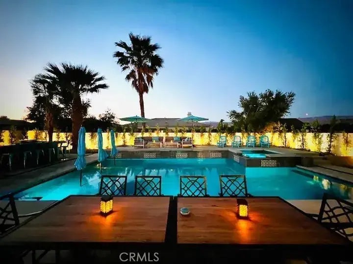 Just Imagine jumping in the Sparkling Oversized Salt Water pool! Welcome to Agua Hermosa! A stunning desert oasis where modern elegance meets serene resort living. With 4 Bedrooms, 2 Baths this home has enough room for the whole family while nestled on a quiet cul-de-sac. Comes with a One Year Home Warranty through Fidelity National Home Warranty. An exquisite retreat that offers a seamless blend of indoor comfort and outdoor indulgence. Step inside to soaring ceilings, an open-concept layout, and beautifully appointed living spaces bathed in natural light. The private backyard is your personal escape, complete with a Oversize Sparkling Heated Salt Water Pool, Spa, Barbeque Island, Fire Pit, Outdoor Shower and Lush LandscapingPerfect for relaxing or entertaining under the desert sky. Two well constructed Pergolas help shade you from the desert sun when grilling your food and when dining outside. Whether youre seeking a Luxurious full-time residence, Vacation home, Investment property, or Short Term Rental for extra CA$H during Coachella and Stage Coach Festivals, this home captures the essence of desert living at its Finest. Experience privacy, comfort, and sophisticated style in the middle of it all. We highly recommend that all Buyers always do their own due diligence on all aspects of this property or any other property that they are interested in.