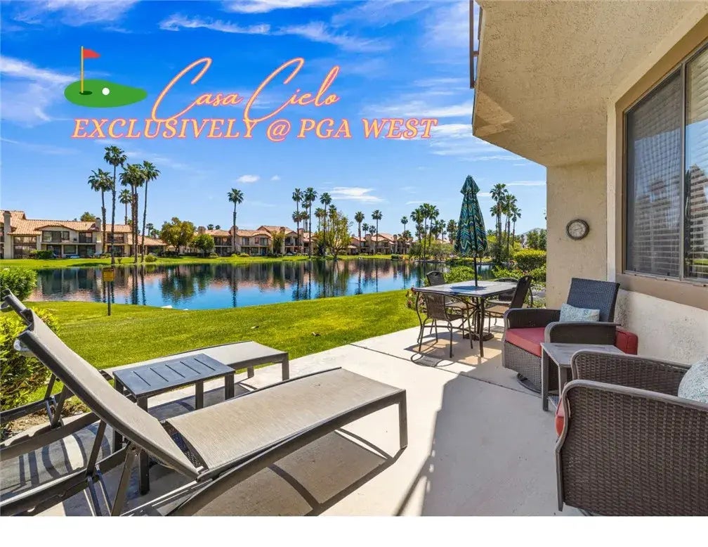 (Pricing reflects the lowest rates of the year; rates may be higher during peak season and other months.) Welcome to Casa Cielo, a luxurious two-story condo with sweeping lake views, nestled within the serene, gated PGA West Palmer Residential community. This 2-bedroom, 2.5-bath home provides the ideal blend of privacy, comfort, and desert beautyperfect for long-term stays or seasonal escapes. As you enter, a light-filled living space draws you in with floor-to-ceiling windows framing the lake. The updated, fully equipped kitchen opens seamlessly into the dining area and cozy family room, creating a welcoming flow perfect for entertaining or relaxing. A spacious breakfast nook offers the ideal spot for morning coffee, while the family room, complete with a fireplace, invites you to unwind. Glass sliding doors lead directly to a private patio with a seating area and a barbecue grill, where you can enjoy sunsets over the lake, dine alfresco, or simply soak in the tranquility of the surrounding desert landscape. Ascend the staircase to find two peaceful bedrooms, each with its own balcony offering sweeping lake and mountain views. The primary suite includes a large en-suite bath, while the second bedroom offers ample space and easy access to its own full bathroom. Recent updates include energy-efficient LED lighting, a new AC system to keep you cool in the summer, and fresh paint for a crisp, inviting feel throughout the condo. (Pricing reflects the lowest rates of the year; rates may be higher during peak season and other months.)
