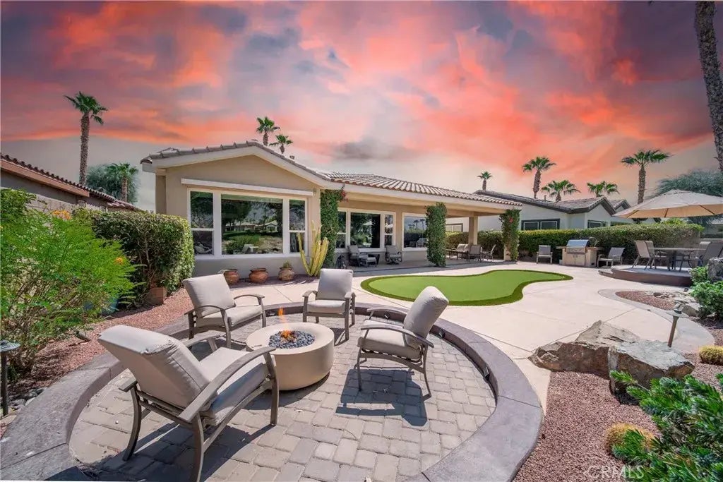 Welcome to Casa Puesta del Sol, a beautiful 3-bedroom, 3-bathroom home in the sought-after Trilogy at La Quinta community, where desert luxury meets everyday comfort. The spacious Monarch floor plan features a bright, open layout with elegant tile flooring throughout the main living areas. The great room, complete with a cozy gas fireplace, is ideal for cool desert evenings, while large west-facing windows frame stunning views of the Santa Rosa Mountains and the golf course. The gourmet kitchen comes fully equippedwith appliances including a coffee maker, espresso machine, slow cooker, blender, and moremaking it easy to prepare anything from a quick breakfast to a dinner party. A dedicated office with a desktop computer and printer offers the perfect space for remote work or quiet reading. Each bedroom is generously sized, with the primary suite offering an en-suite bath with dual vanities and a luxurious shower. A private casita provides guests with their own comfortable retreat, complete with TV, storage, and full bathroom. Outdoors, you can practice on the backyard putting green, relax under the retractable shade in the master bedroom, or gather around the fire pit and gas barbecue for sunset evenings. As a guest, youll enjoy access to Trilogys resort-style amenitiesincluding multiple pools and hot tubs, a bocce ball court, pickleball and tennis courts, a well-equipped fitness center, Caf Solaz, and the on-site Coral Spa. Whether youre seeking a winter getaway or year-round living, Casa Puesta del Sol offers the perfect blend of leisure, convenience, and luxury. Security