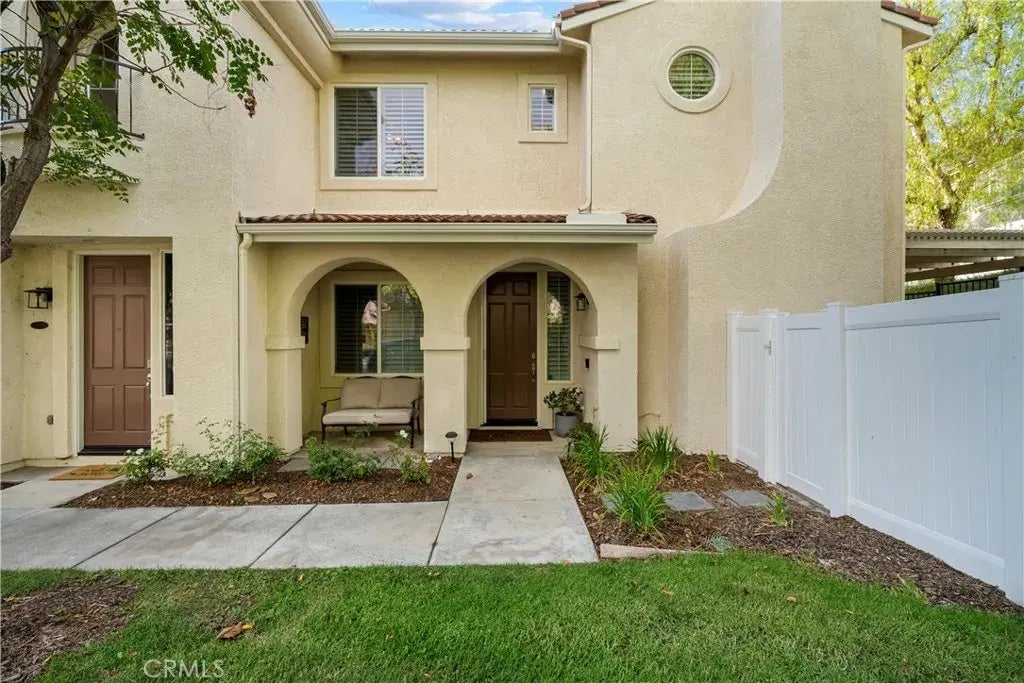 Welcome to this meticulously maintained 3 bedroom, 2.5 bathroom end corner unit in the highly sought-after Galleria at AltaVista community. Offered by the original owners, this home has been immaculately cared for and is truly turnkey and move-in ready. It has a private porch entrance with a grassy area in front. The family room is spacious enough for your biggest get togethers. The kitchen overlooks the family room and has an ample counter space, updated appliances, and endless pantry storage. The main level powder room, formal dining room and downstairs laundry room add convenience and functionality. Upstairs youll find three generous bedrooms and two full bathrooms. The primary suite features dual closets and dual sinks, while one of the secondary bedrooms includes a walk-in closet. Additional highlights include an attached 2-car garage with direct access and built-in storage, a private yard ideal for barbecues and entertaining guests, a Ring doorbell and keyless entry. Upgrades include travertine, wood laminate flooring, base and crown molding, built in TV entertainment center and backyard cement patio with pergola. The Galleria at Alta Vista offers wonderful amenities including a sparkling pool and park. The location is unbeatableclose to award-winning schools, shopping, dining, freeways, parks, public transportation and miles of scenic paseo trails. Dont miss the chance to own this pristine home in one of Valencias most desirable neighborhoods!
