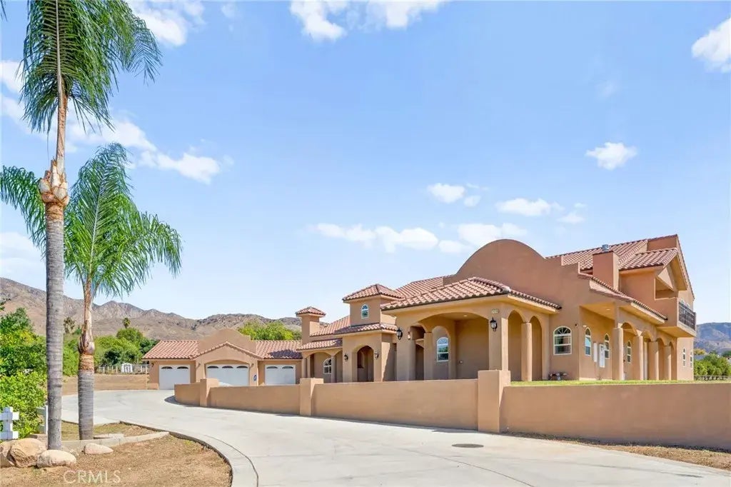 Custom built estate at the top of the cul de sac situated among other custom homes surrounded by city views and mountain. Come through the long driveway that leads to a Spanish/Mediterranean boasting 5,675 sq.feet property and 3 car garage is over 1,300 sq.feet and RV parking available.Enter the home to a grand entrance leading to a large living room with dramatic fireplace, all in an open floor plan with abundance of natural light. This estate has a large kitchen with a huge island, self closing cabinets, ample storage that opens to the dining and living room. There are 2 primary suites located one upstairs and one downstairs along with 3 more bedrooms and bonus rooms. There are 2 brand new AC, 2 brand new tankless water heater and certification for septic recently completed.This home rests on 1.69 acres. There is plenty of potential with entertaining guests outside or used for equestrian and zoned for a second unit. Its close to schools, shopping, and hospital. Located in close proximity to I-210 and I-10 freeway.