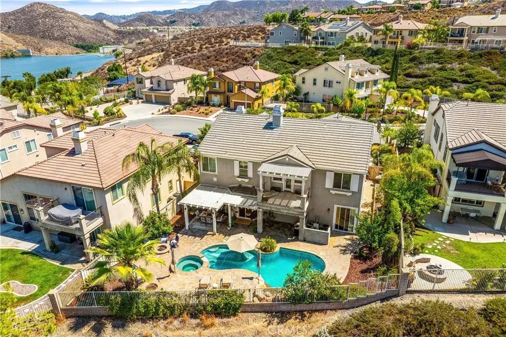 Stunning Pool Home with Paid Solar in Sought-After Watermark Community at Tuscany Hills! Welcome to this beautifully upgraded home nestled in a quiet cul-de-sac within the prestigious Watermark community of Tuscany Hills. This residence offers the perfect blend of luxury, functionality, and resort-style living. As you enter, youre greeted by an elegant formal living and dining area on the right, ideal for entertaining. To the left, a spacious private suite on the main level features upgraded wood flooring, its own exterior access to the backyard, and is perfect for guests or multi-generational living. The chefs kitchen is a true showstoppercomplete with a large center island with bar seating, granite countertops and backsplash, double ovens, stainless steel appliances, abundant cabinetry, and a convenient butlers pantry connecting to the formal dining room. Just off the kitchen, a secondary living space offers direct access to your own backyard oasis. Step outside to enjoy the breathtaking backyard, designed for relaxation and entertainment. It features a custom saltwater pool and spa, a cozy fire pit, paver decking, and a covered patioperfect for outdoor gatherings. Upstairs, youll find four additional bedrooms. Two share a Jack-and-Jill bathroom, one enjoys its own private ensuite, and the expansive primary suite is a retreat of its own. The primary bath boasts a jetted tub, custom shower, dual vanities with a dedicated makeup area, and a generous walk-in closet. Step onto the private balcony to enjoy serene views of Canyon Lakean ideal spot for morning coffee or sunset u