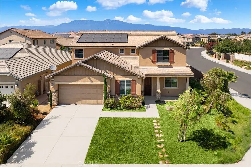 Solar will be PAID OFF! New FLOOR, NEW PAINTING. Built by Lennar homes in 2018, located in the beautiful Harvest Villages in Jurupa Valley surrounded by mountains. The property offers 5 spacious bedrooms, 3 bathrooms. As you enter the long and inviting foyer you will pass by the downstairs bedroom and bathroom and the office room across from. Continuing through the foyer is the formal dining room, kitchen and the living room with abundant natural light. The loft on the second floor offers additional living space to use as you desire. The primary suite is oversized and feels like your own personal retreat. The primary ensuite bathroom is accented by dual sinks as well as a large tub and separate shower. The primary walk-in closet is nearly as large as another bedroom with plenty of room for clothing and additional storage. The upstairs laundry room has ample space with built-in base and overhead cabinetry. Convenient access to the 15, 60 and 91 freeways.